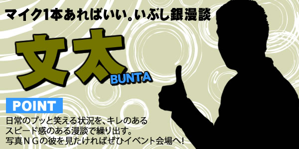■コメント■ ニャンテッドファミリーで最も地味だと名高いピン芸人です。地味な喋りと地味なパフォーマンスで皆さんをいぶし銀な世界にお連れします!◆活 動 歴◆ ■2010.7.31 ニャンテッドファミリー倉敷路上ライブ■2010.8.22 ニャンテッドファミリー倉敷路上ライブ ■2010.10.10 ニャンテッドファミリー倉敷路上ライブ ■2010.10.30 「岡山国民文化祭」出演 ■2010.11.14 ニャンテッドファミリー岡山路上ライブ |